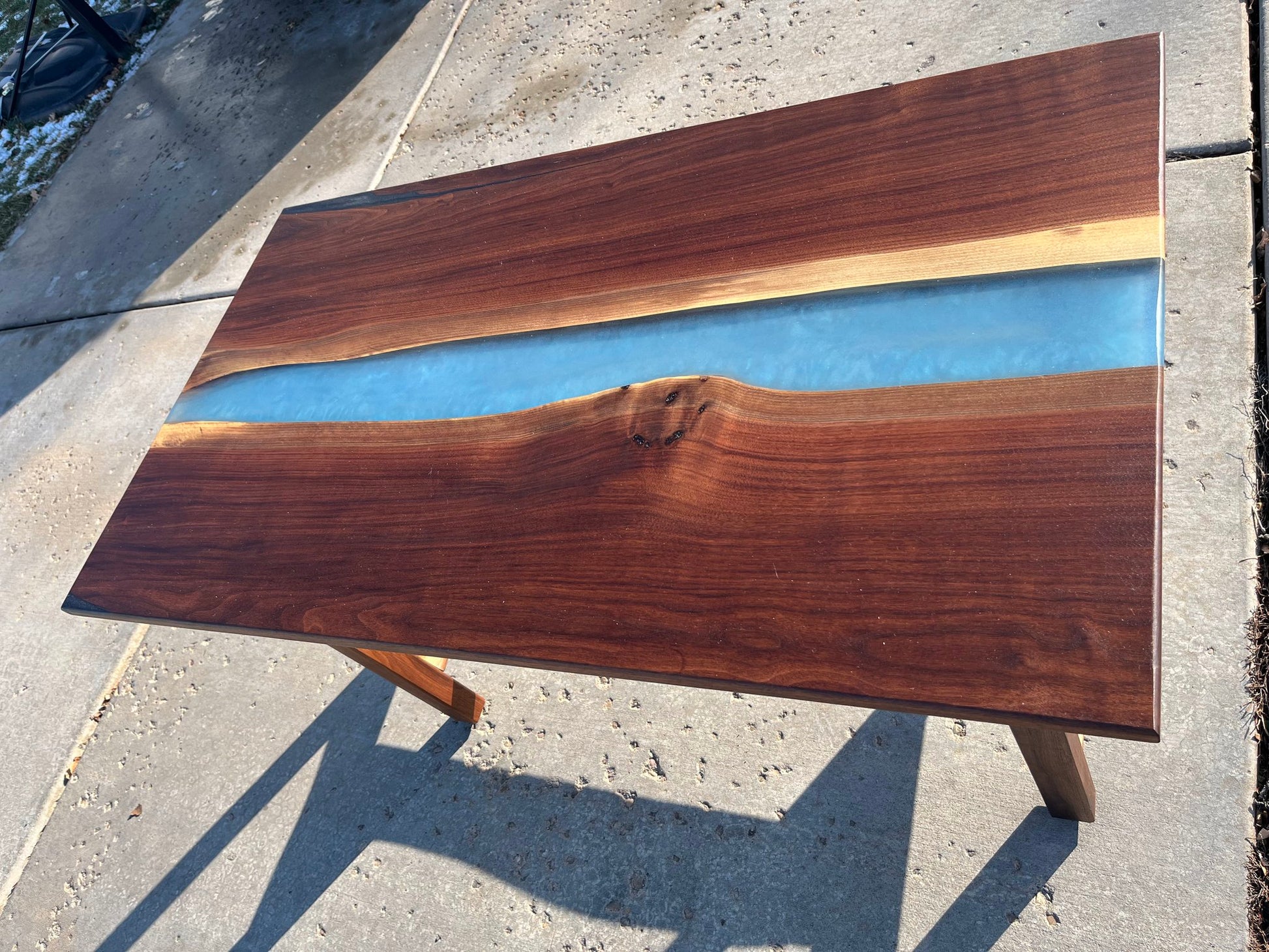 This custom table features a 30-inch by 53.5-inch black walnut top, highlighted by a stunning blue epoxy river that flows through the center, creating a bold and artistic focal point. The table stands 31 inches tall, offering a versatile height for dining, work, or display.